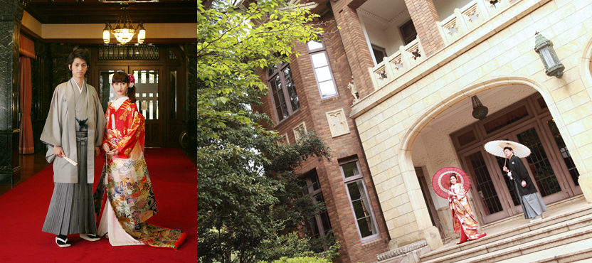 前田侯爵邸は「和」と「洋」が入り混じった独特の雰囲気がある洋館で、内装に大理石や西洋模様の壁紙などを使いつつも、 寄せ木張りの床や漆喰の壁など日本のものもうまく取り入れています。和と洋を絶妙なバランスで調和させているから和装にもよく合い、 日本庭園にはない独特の魅力があります。